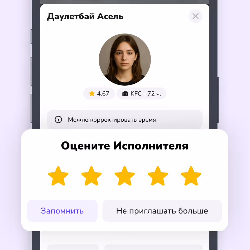 Все Исполнители проходят проверку системы и верификацию. Дополнительно система учитывает их рейтинг, количество завершенных смен, опыт работы и отзывы работодателей.