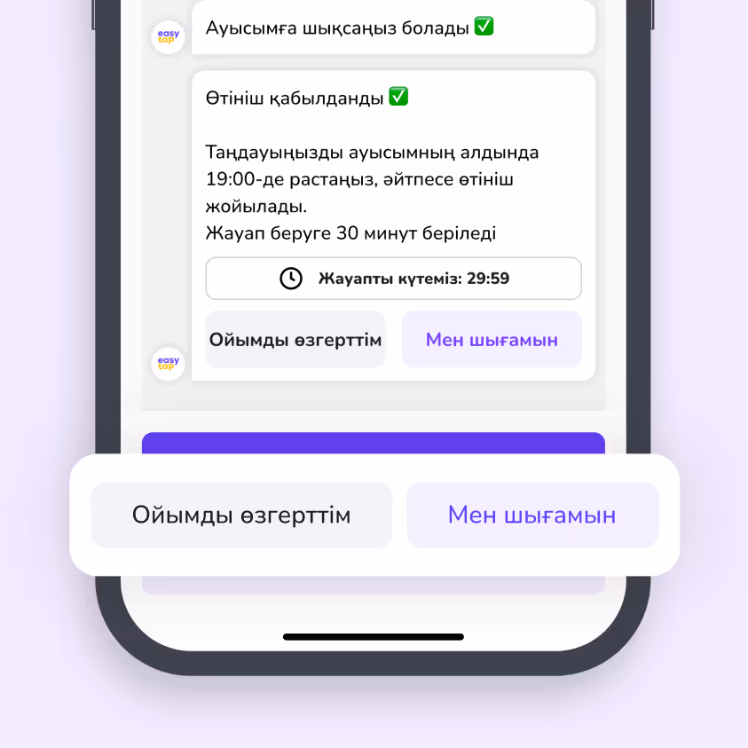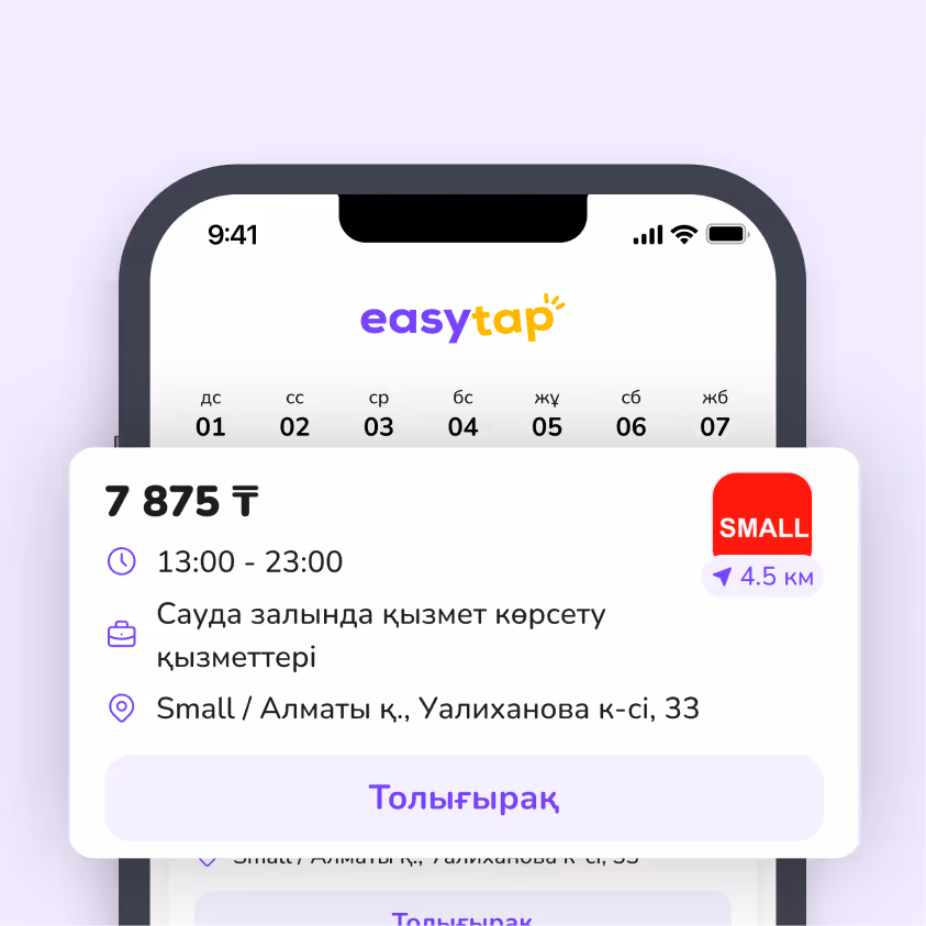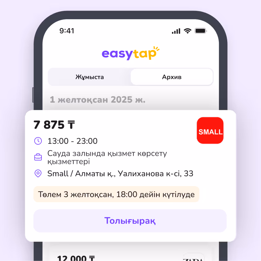 Егер төлем толық көлемде түспесе, қолдау қызметіне хабарласыңыз — біз мәселені анықтауға көмектесеміз. Қолдау қызметімен EasyTap қосымшасы арқылы байланысуға болады.