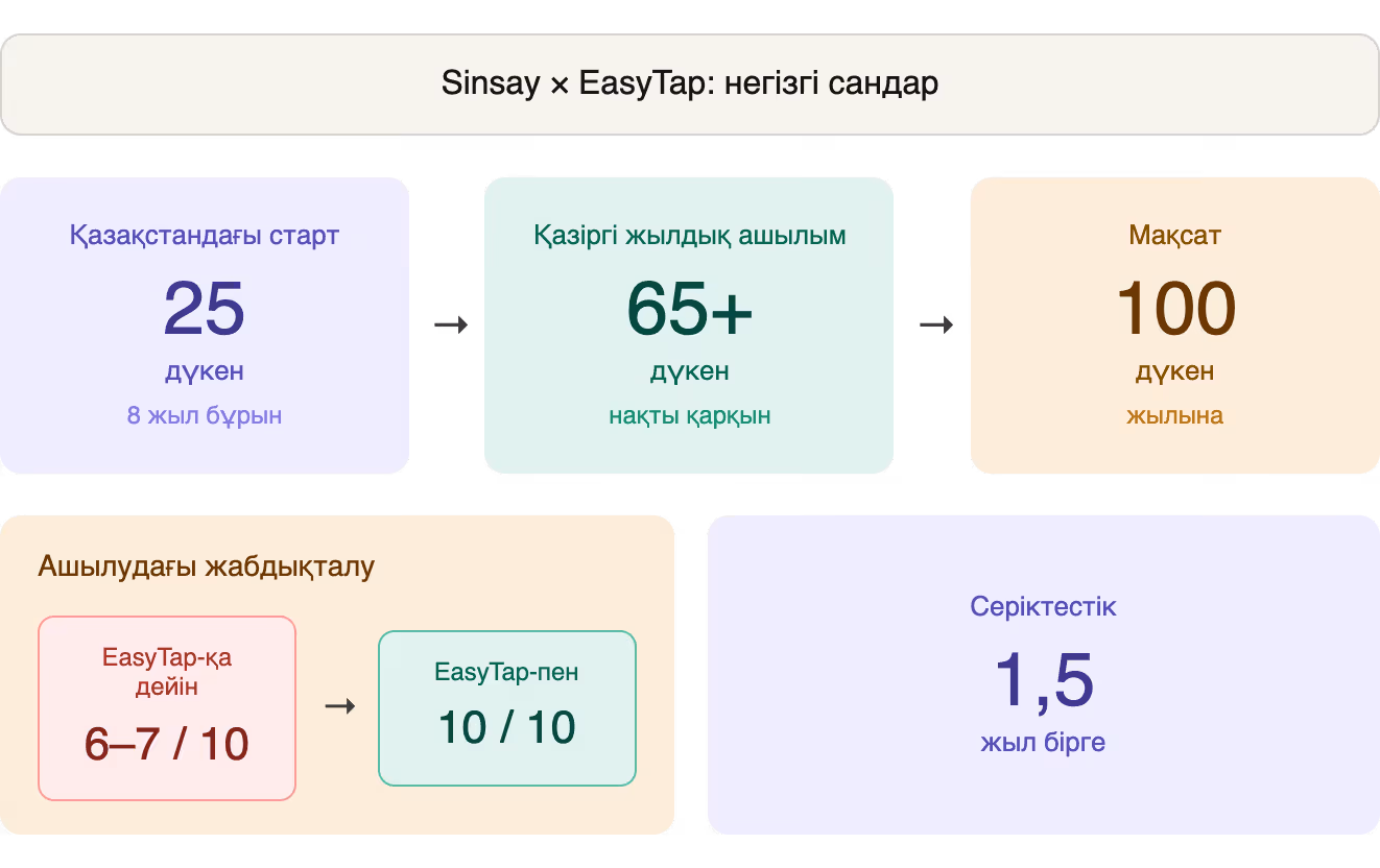 1,5 жылдық серіктестік барысында EasyTap Sinsay үшін жай мердігер емес, операциялық инфрақұрылымның бір бөлігіне айналды. Әр ашылу стандартты схема бойынша өтеді: қосымшадағы өтінім → растау → команда қажетті күні орнында.