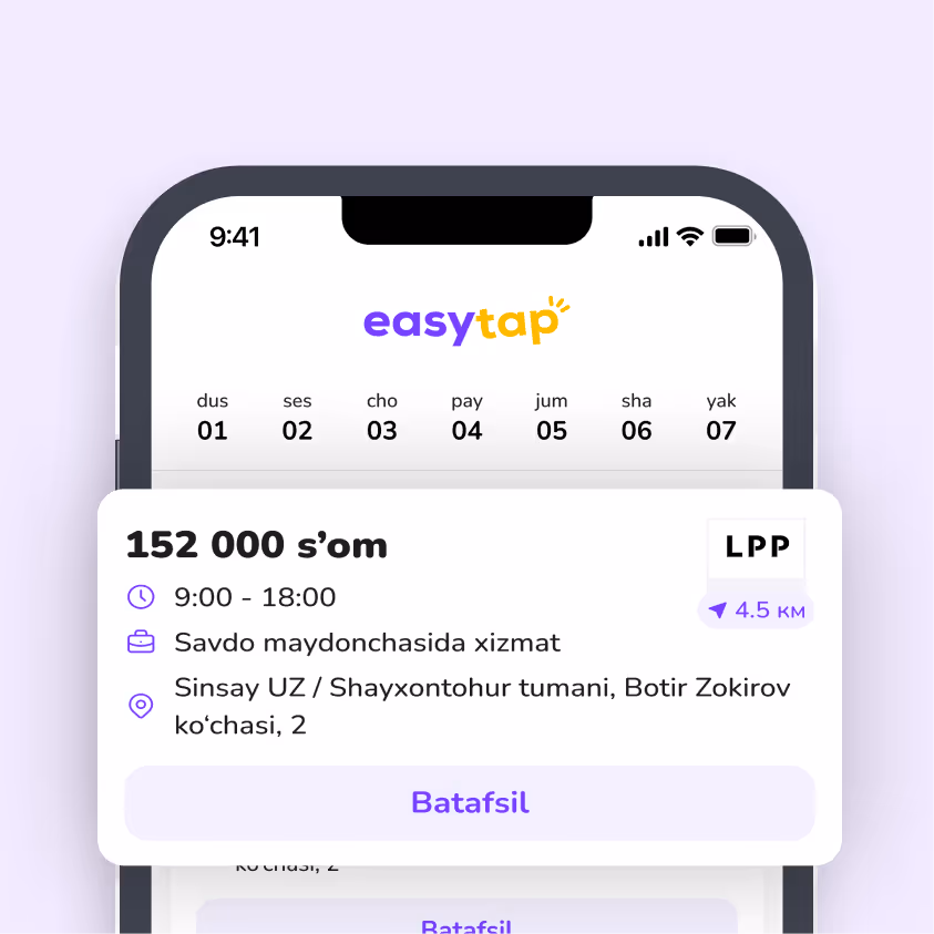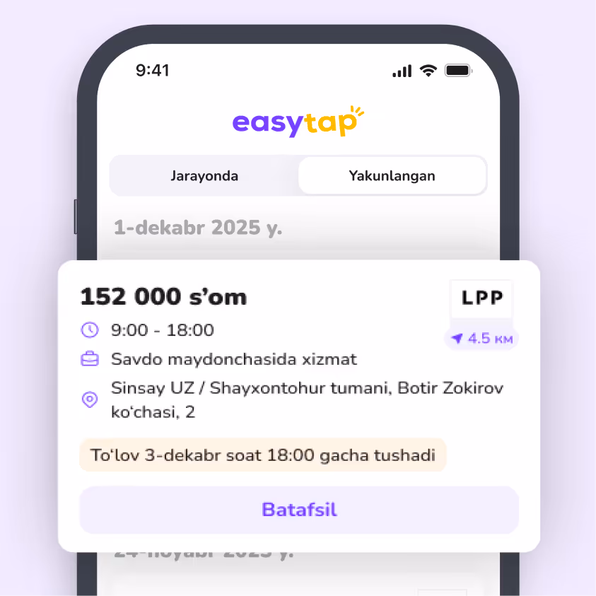 Agar toʻlov toʻliq miqdorda tushmagan boʻlsa, qoʻllab-quvvatlash xizmatiga murojaat qiling — biz masalani aniqlashga yordam beramiz. Qoʻllab-quvvatlash bilan EasyTap ilovasi orqali bogʻlanish mumkin.